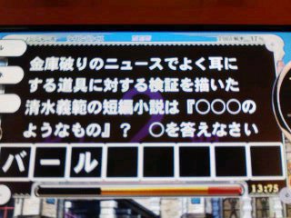ボクのファンに申し訳が(多分いないw そして此の頃QMAってないパソ開いてないのバンバンざいですw とあるネトゲは空腹で死んでましたw とりあえず主催者から許可いただいたのでオフ会の詳細を 10/8(日)秋葉原でオフ会(人の名前は全て敬称略とさせてただきます 主催者ウィズ 集合時間14時(あたしは多分それより結構前にきてると思うw) 集合場所トラタワQMA台前 参加者現段階(ウィズの情報より) ウィズ、Vasil、ろっきぃ(確定ではないらしい)、瑞奈(資金状況により凝れない可能性がw) です 解散は17時(ウィズ撤退時間)~∞(マテウス 苦情は随時受付中w(特に参加者あたり間違えたらかなりスイマセン メールアドレス(瑞奈)djibril-jade-ruquia-mizuna@ezweb.ne.jp とりあえず当日イキナリ参加も多分おkなのでw 参加する場合、特に私(及びウィズ)の顔を知らない人はメアドを確保しておいてください 返信>> よみさん 連コ厨乙ですね… あたしもですが(ちょw まぁ賢者になってからは回りを見てますよw (賢者連コは終ってるらしいです) シキさん カップル用ですかw 一人身で他サテあいてるのに其処に座ろうとする人ってどれくらいいるんだろうかw zanaさん ありがとーございます 「バール」のようなものであってますよw これを間違える賢者は「マロン先生にあやまれ!」byかれいなほし スンマソンうちのブログはなんかアレなんですよ(新しいのは後ろに回る 一応右側の最新記事から飛べますのでそれしかないですね(検索エンジンだと中途半端なのが出て来た なにっ!乳揺れが1/2っ それは萎える(マテウス 無類のきょぬー好きですよ?悪いですか(カエレ ルキアのサブカを作るとき「KYONEW」(キョン(涼宮ハルヒの憂鬱)Newをかけたw)なんか考えても見ましたよw(まぁ「みずな2しき」ですがw MAITOさん あちらの掲示板でも見させていただきましたw 見た瞬間に「ちょw」なんてw まぁあたしもそんなんですけどねw けよりなは10/8日からですね オフ当日後だから忘れないようにしないと というかミア役の「成瀬未亜」氏がせっかく名前を変えてるというのに はぴねすでゎ「成瀬未亜」そのまんまで載ってましたよw(でもキャストの中にひと美がいたので何かと疑問さんw これがウチのコメントですw Mじゃないぞっ! 今日の戦績 0-1-1-0#0-1-1(1-0-0) ホビオチ 屈辱…エルフになってから始めてのスクポマイナス… まぁ成績もあまりよいほうではなかったし… 今日はこの問題が出たおかげで15点で通過w 実在するとは思わなかった… しかもNew問… マロン先生を知るものにしかわからないようにしたなコンマイw 知らぬものは真髄のQMAファンとゎいえ(ry というかエルフ2回線で全部60%以下とか…(一個59%が出たくらいで後は40%以下 そして2回戦オチのもの… 恐ろしくCPUが空気読まない… 1回戦→COM全員生き残り 2回戦→ディアナとイザベラが60点代(芸能四文字、黒い問題が1つとそれなりの問題が1つと簡単の問題が4つ 57点の私は9位で落下… 頼むから空気嫁 来月の29日ソラリス大会なのですが… この日…ウチの学校の修学旅行の最終日だしっ! 参加は略不確実… 運が良ければ帰りによるくらいですね…最悪…orz なんでヨリによって来月は第5日曜日なんだ…orz >>返信 横浜はわかりませんが 秋葉原レジャランは24台あるそうですよ まぁ1クレ200円なので全員そろう事は略ないそうですw U0のホームのZIPPYも過去は2台サテでしたよw 今じゃソラリスよりいい状態ですがw