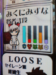 まぁ何はともあれ賢者になりました 大窓1~賢者に20クレ以上かけたりその間にドラ→ケル→サイクロだけどなっ! とりあえず220クレくらいですね 平均の80~50クレくらい遅いですね まぁ初期からだからなっ!(言い訳 まぁソラリスでは七人目の輩出賢者だそうで 因みに前作は瑞奈の賢者輩出先はムー本庄w(一回しかいったことありませんぉw 店内ランクも11位となりました まぁ当初護国のほうは賢者になったら後は「みずな」に変える予定でしたが(みずな第2カード説w アニエフェの正解率が20%も違うので護国を使いつづける予定w とりあえず決勝で「聖甲機」とか「紅忍」とか「獣神将」とか「椋尾篁」とか出てほしいです、いや4つ目は間違えたんですけどねw ぶっちゃけ「篁」は読めるのたのに苗字間違えるとものすごく空しい気持ちになります まぁRoutesやってる人にはわかりますよw「篁」はw まぁ名前としてはどうなんだろう… そして決勝では何故か大窓1級のアニエフェが易問2つグロ問1つなのに 初級の学並びが普通1門グロ問2問とかねもうやる気ナシス そうそう瑞奈@ルキアのコメントでこんなん考えてみた… ~~~!~~~~~~ え?隠れてる?おかしいなぁ(ェローなネタ故w まぁ見つけたら みずなえr(ry スイマセンモウイイマセン 裏技?チックなこと 賢者になった直後にケータイで白服に帰るとアバターが白いのにグラフィックは黒のままw 次クレにはちゃんと白だったがなw まぁこれは通常でもなってるかどうかゎシランw 返信>> MAITOさん 私は本名、瑞奈、護国瑞奈(名前と苗字の英田(あいだw)にスペースを入れた奴も)全て男率80%以上でしたよw 96%男とかナケテキター ZANAさん でも家柄からしてかとりひとしのほうが会うような希ガスw(マテウス まぁ私はたかむらみずながほしいですw(7文字) てなわけで翠さん達に言う科白は 「玲…瑞奈を俺に下さい!」 直後仁(じん)の顎に衝撃が走ったのは言うまでもないw